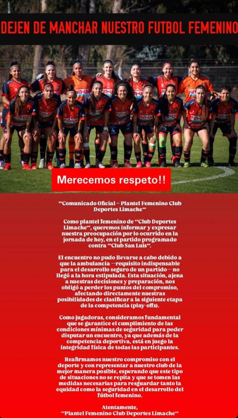 Las jugadoras limachinas emitieron un comunicado donde hablaron del tema. “Esta situación, ajena a nuestras decisiones y preparación, nos obligó a perder los puntos del compromiso, afectando directamente nuestras posibilidades de clasificar a la siguiente etapa de la competencia (play-offs)”, comentaron.